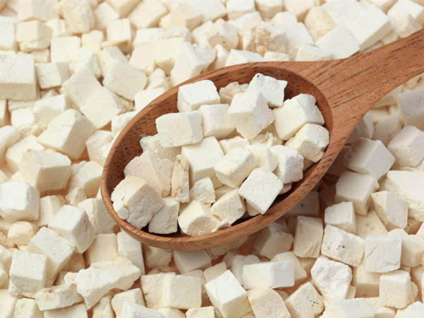 茯苓个:呈类球形、椭圆形、扁圆形或不规则团块,大小不一。外皮薄而粗糙,棕褐色至黑褐色,有明显的皱缩纹理。茯苓个体重,质坚实,断面颗粒性,有的具裂隙,外层淡棕色,内部白色,少数淡红色,有的中间抱有松根。气微,味淡,嚼之粘牙。茯苓块:为去皮后切制的茯苓,呈立方块状或方块状厚片,大小不一。茯苓片:为去皮后切制的茯苓,呈不规则厚片,厚薄不一,颜色呈白色、淡红色或淡棕色。